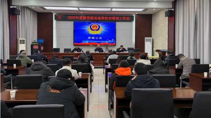 1月22日上午,株洲市茶陵县公安局召开2026年全县娱乐场所治安管理工作会议。局党委委员、副局长王荣凯出席会议并讲话,治安大队、各派出所相关负责人及全县娱乐场所经营负责人参加会议。