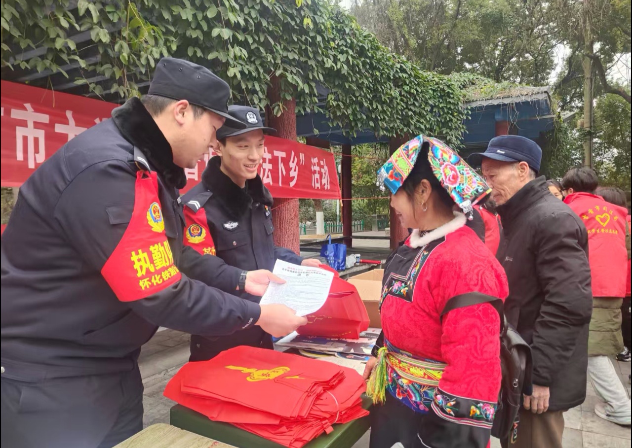 本网讯(赵伟雄 向帮国 刘亚平) 1月28日,怀化铁路公安处吉首站派出所联合吉首市司法局,在吉首市峒河公园开展宣传活动,为辖区群众送上“法治年货”。